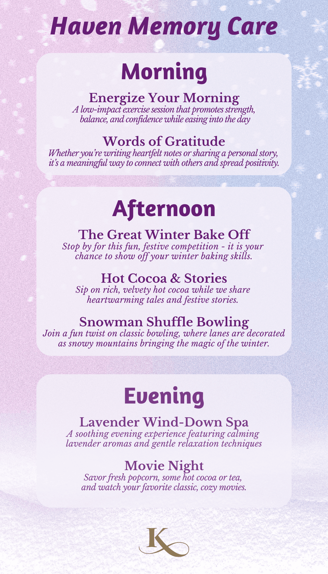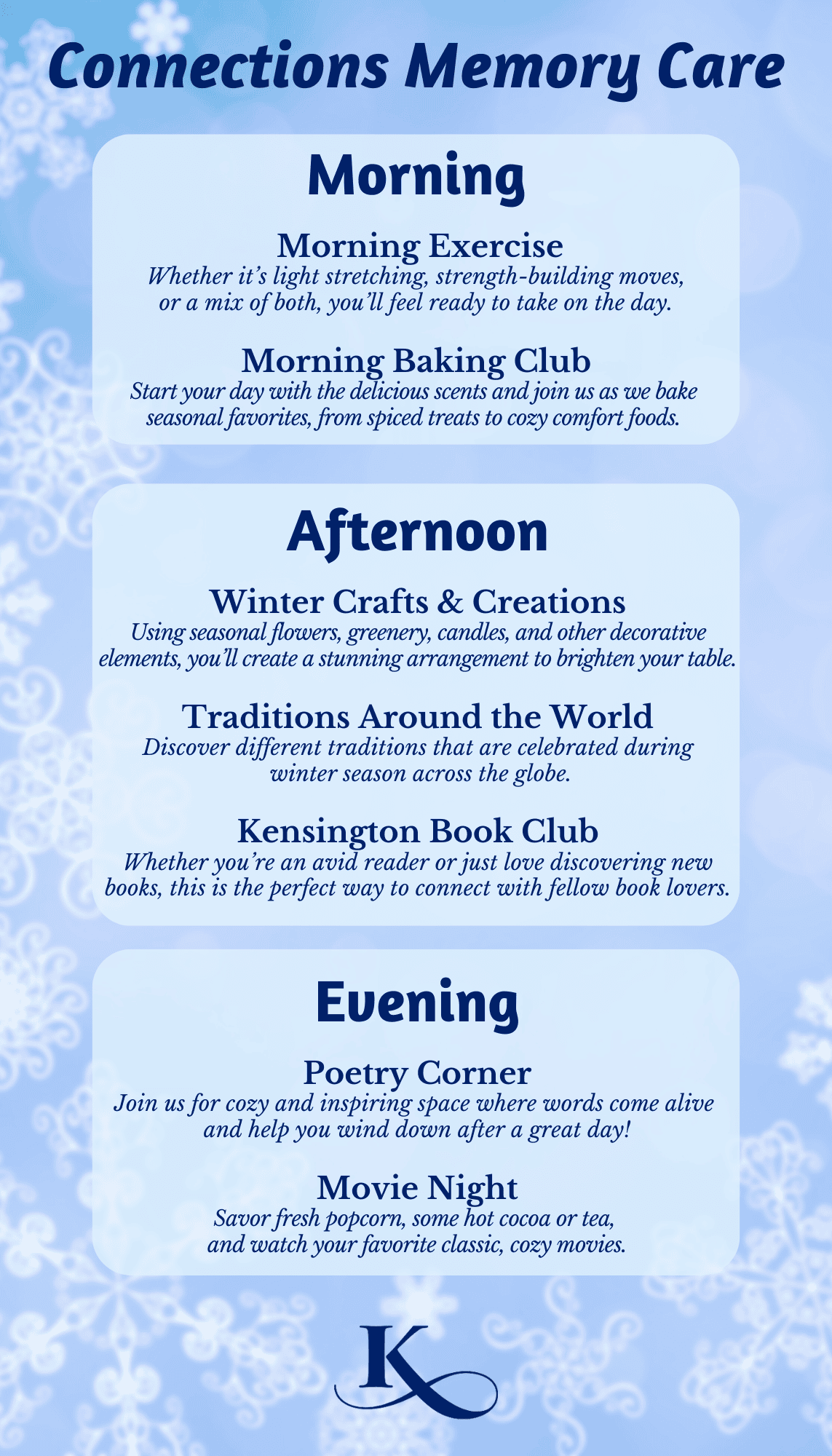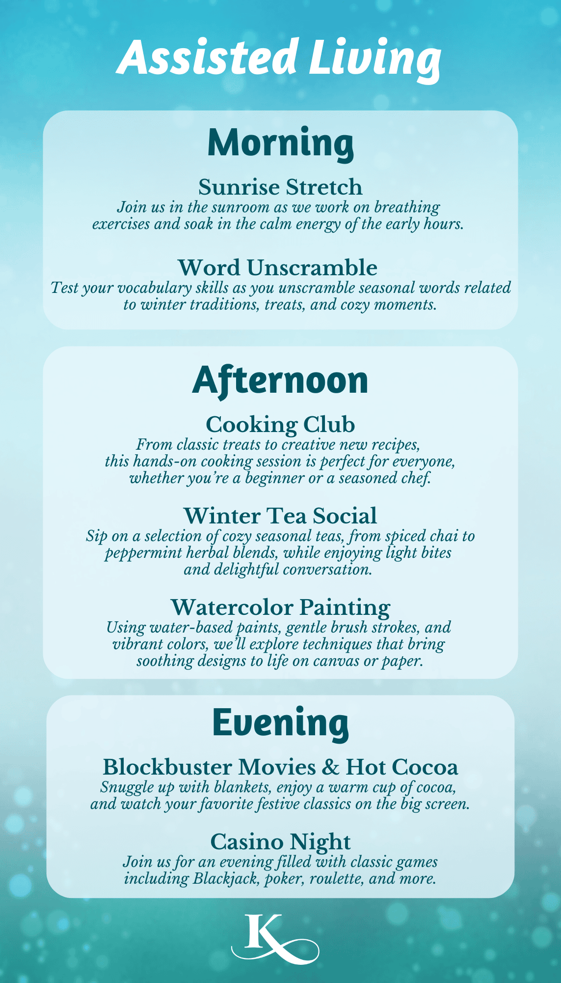 Activities and friendships have been shown to reduce stress, preserve wellness, keep the mind sharp, and increase feelings of worth, especially for seniors. So, we are always searching for new ways to stimulate the mind, strengthen the body, and nourish the spirit.